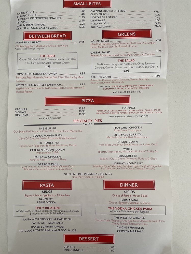 The Pizzeria of Bayport Menu